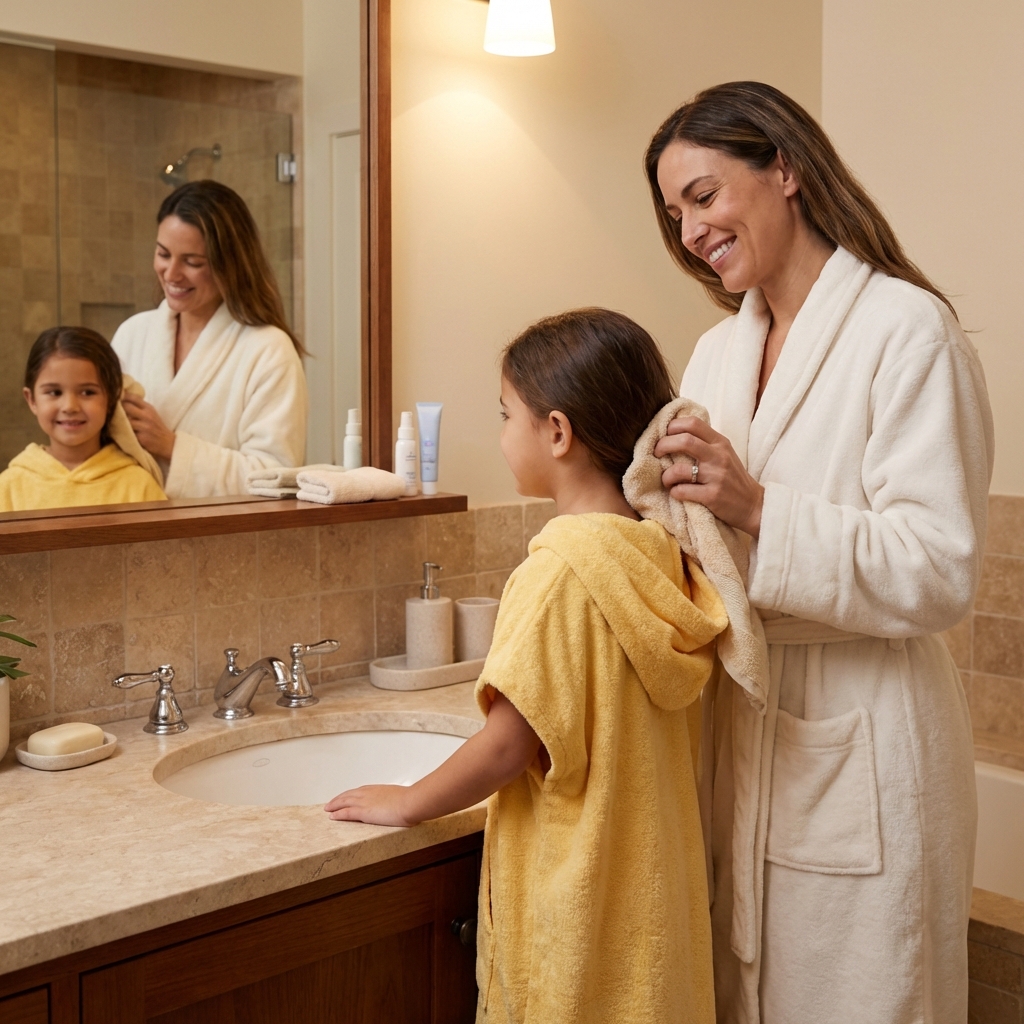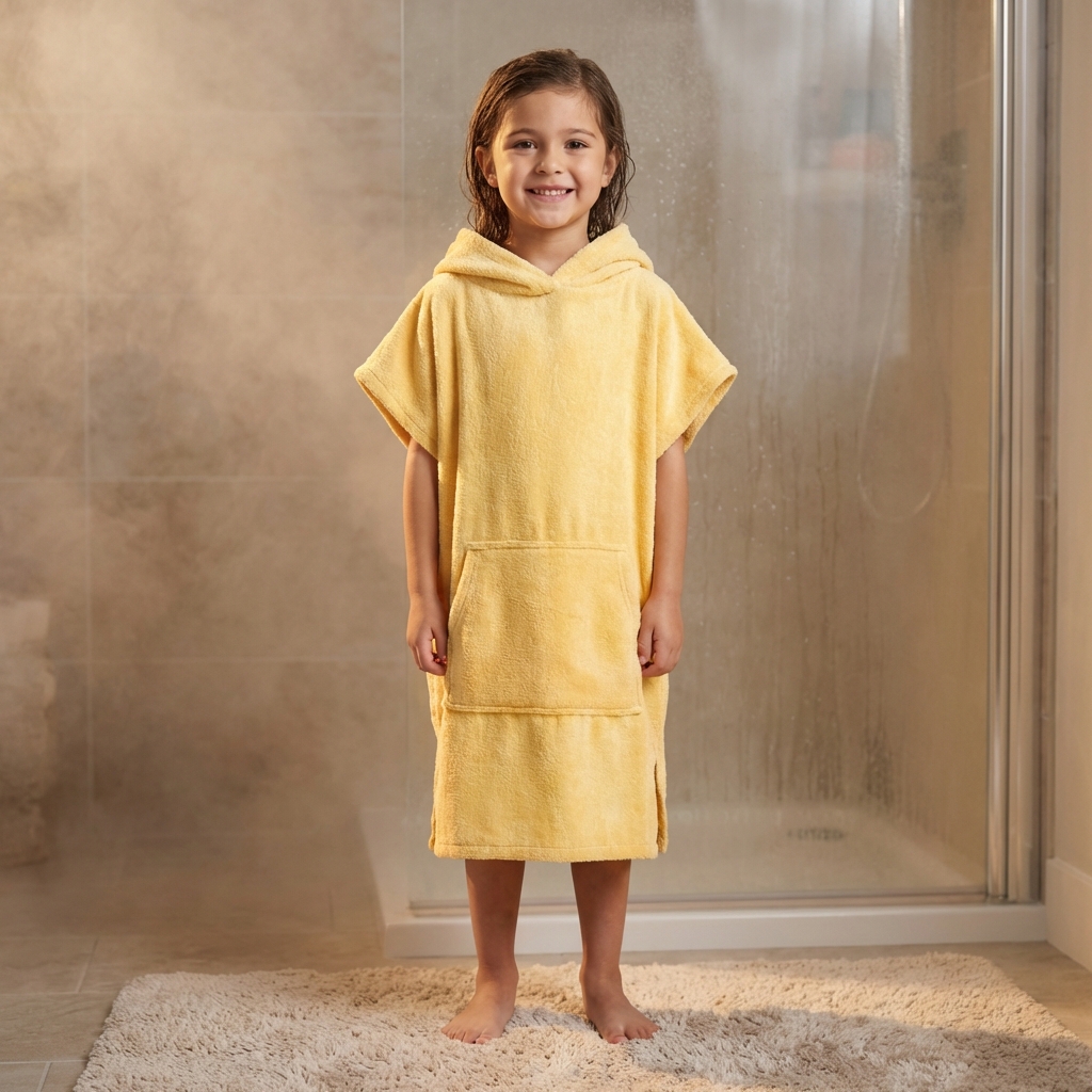 - Diseño ergonómico: Formato de capa con capucha que facilita el secado del cabello y retiene el calor corporal tras el baño.