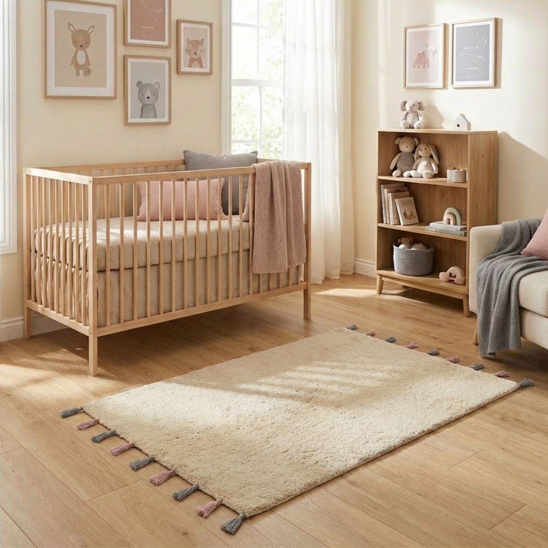 La alfombra infantil beige con borlas es una opción encantadora y funcional para decorar la habitación de los más pequeños, aportando un toque divertido y con mucho estilo.
