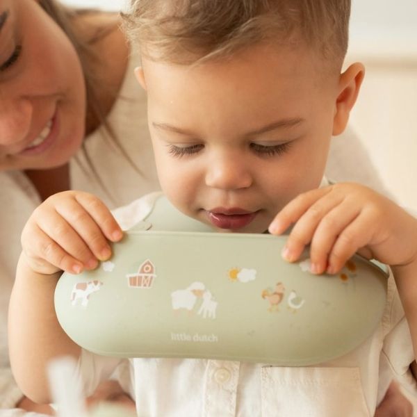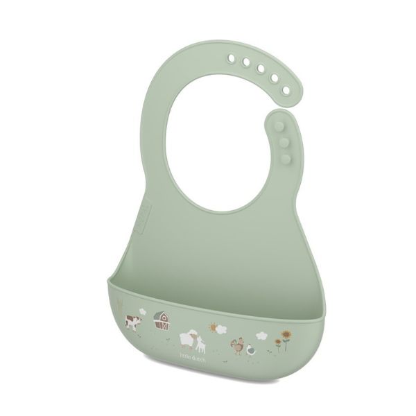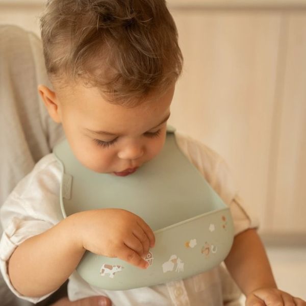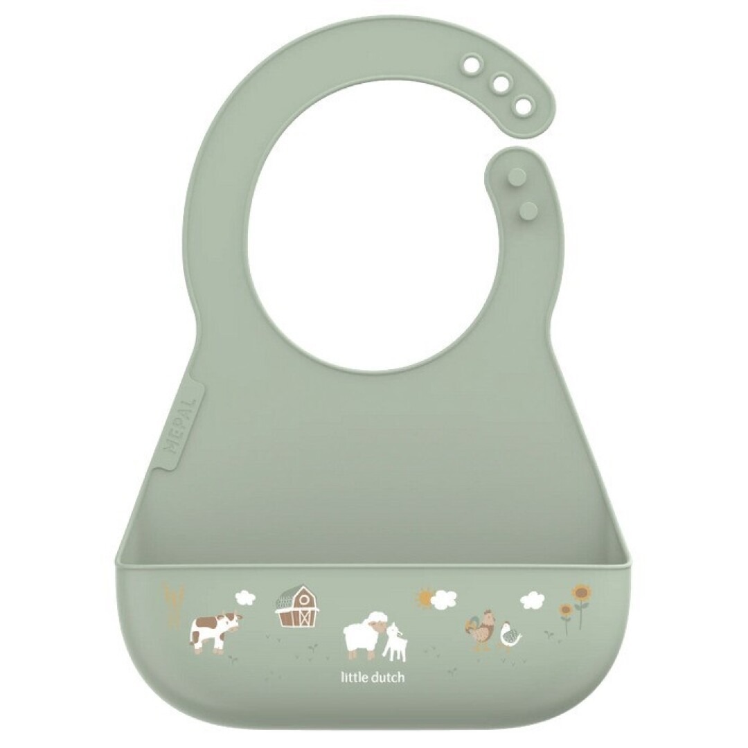 Babero de silicona, en color verde, con un precioso estampado de animales de la granja. Cuenta con cierre ajustable en el cuello y un bolsillo para recoger los restos de comida, agilizando la limpieza.