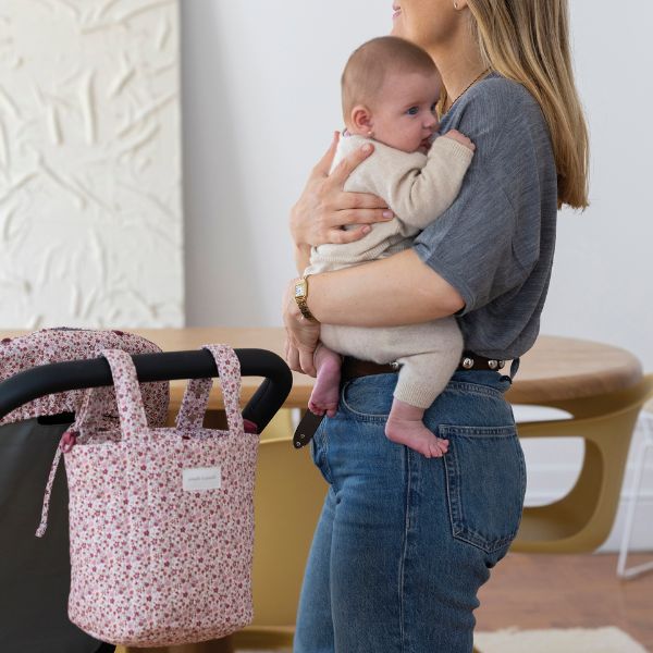 Bolso tipo bucket para carrito, diseñado en un dulce estampado floral en tonos rosas y rojos. Este bolso, es el complemento perfecto para llevar lo esencial del bebé con estilo y comodidad durante tus paseos. Su tamaño compacto, es ideal para organizar pañales, biberones y otros artículos necesarios, manteniéndolos siempre a mano. La bolsa cuenta con un práctico cierre tipo saco con cordón ajustable, que asegura tus pertenencias.