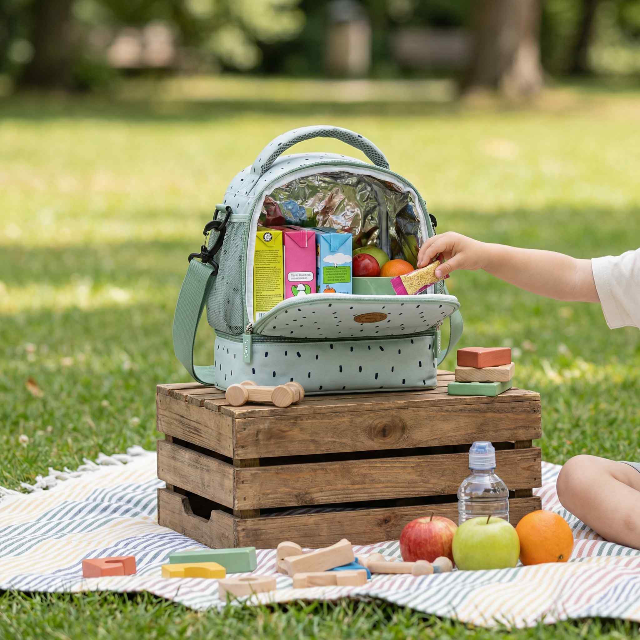 Esta bolsa térmica hace mucho más sencillo transportar la comida del bebé. Con un precioso y actual diseño, es el complemento ideal para los viajes cortos del día a día y las escapadas en familia. Podrás llevar la comida de tu peque a cualquier parte, bien organizada y en su temperatura óptima. Dispone de dos compartimentos térmicos independientes, con cierre de cremallera, que permiten transportar al mismo tiempo alimentos fríos (manteniendo la temperatura 3-4 horas) y/o calientes (hasta 5-6 horas). Además, cuenta con un bolsillo complementario para organizar el resto de accesorios de alimentación, como servilletas o cubiertos.