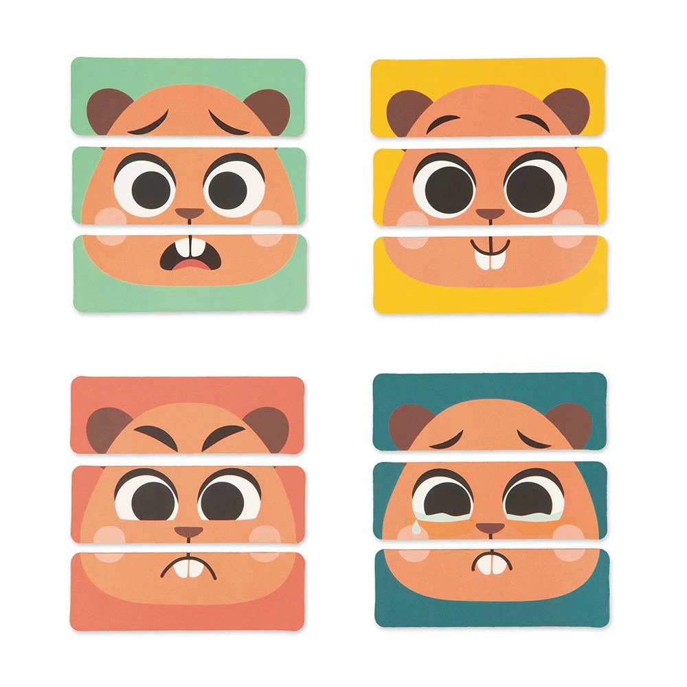 Un puzle de madera sobre las emociones, con 4 emociones representadas para ayudar a los peques, a ampliar su vocabulario y comprender mejor sus sentimientos.