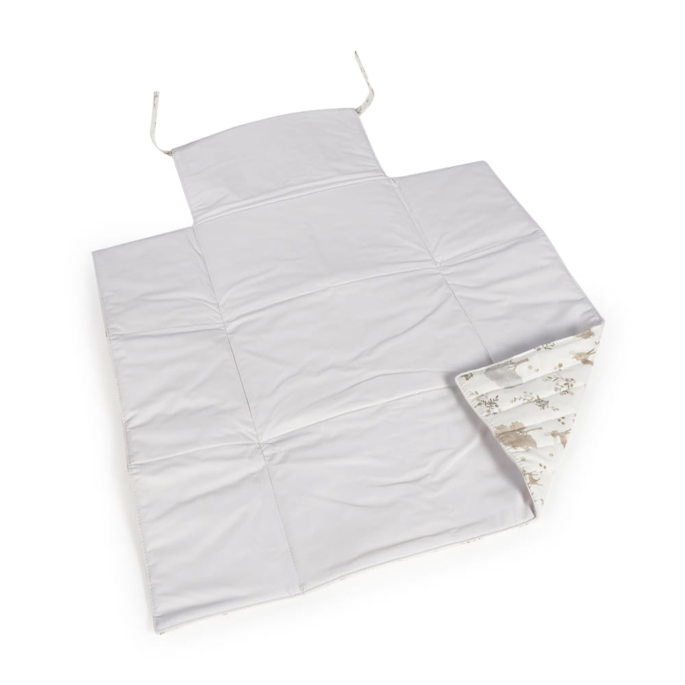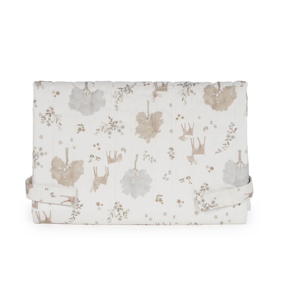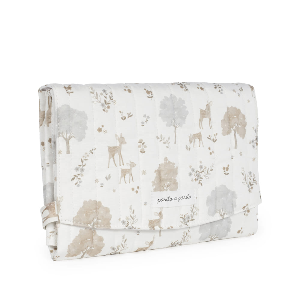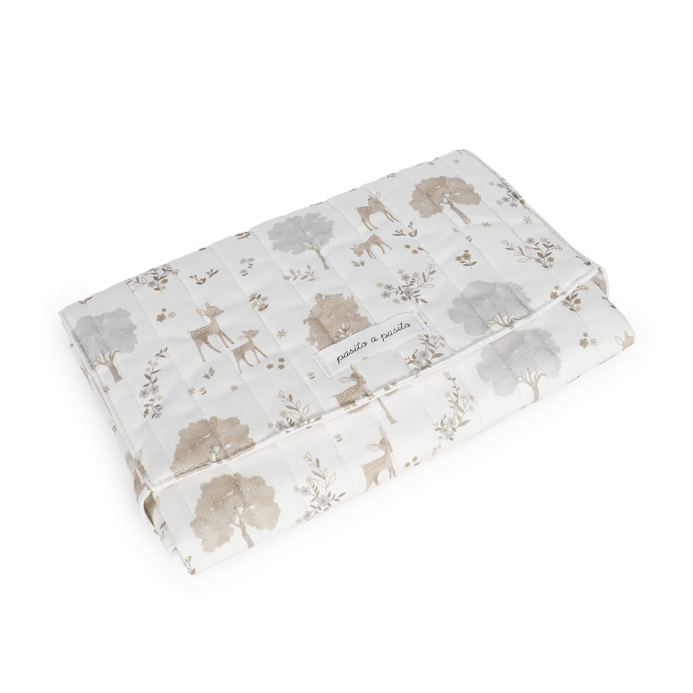 El cambiador para bebé Nara de Pasito a Pasito está elaborado en loneta de algodón 100% con un delicado estampado de ciervos y árboles en tonos neutros.
