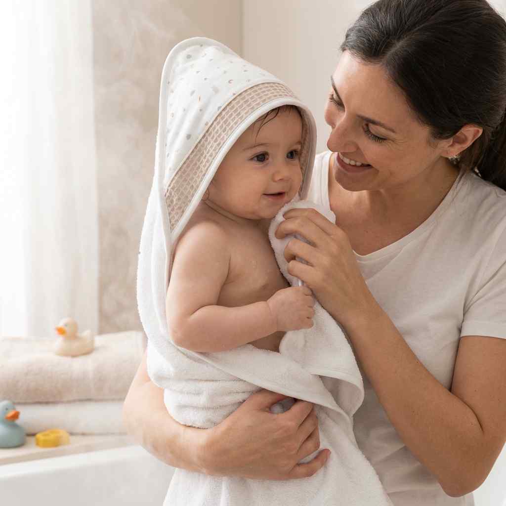 La Capa de Baño de Cambrass está especialmente diseñada para secar al bebé tras el baño, garantizando la máxima suavidad y cuidado para su piel delicada.