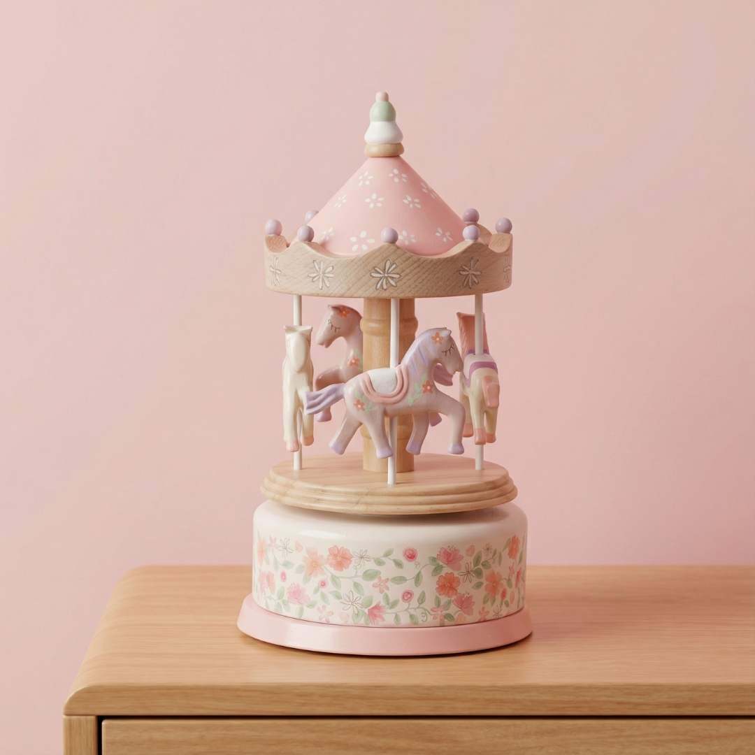 Este carrusel musical presenta un diseño refinado que muestra unos adorables caballitos girando al son de una melodía suave, creando un ambiente relajante y acogedor.
