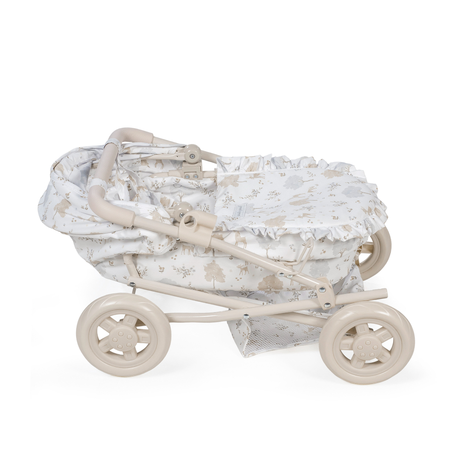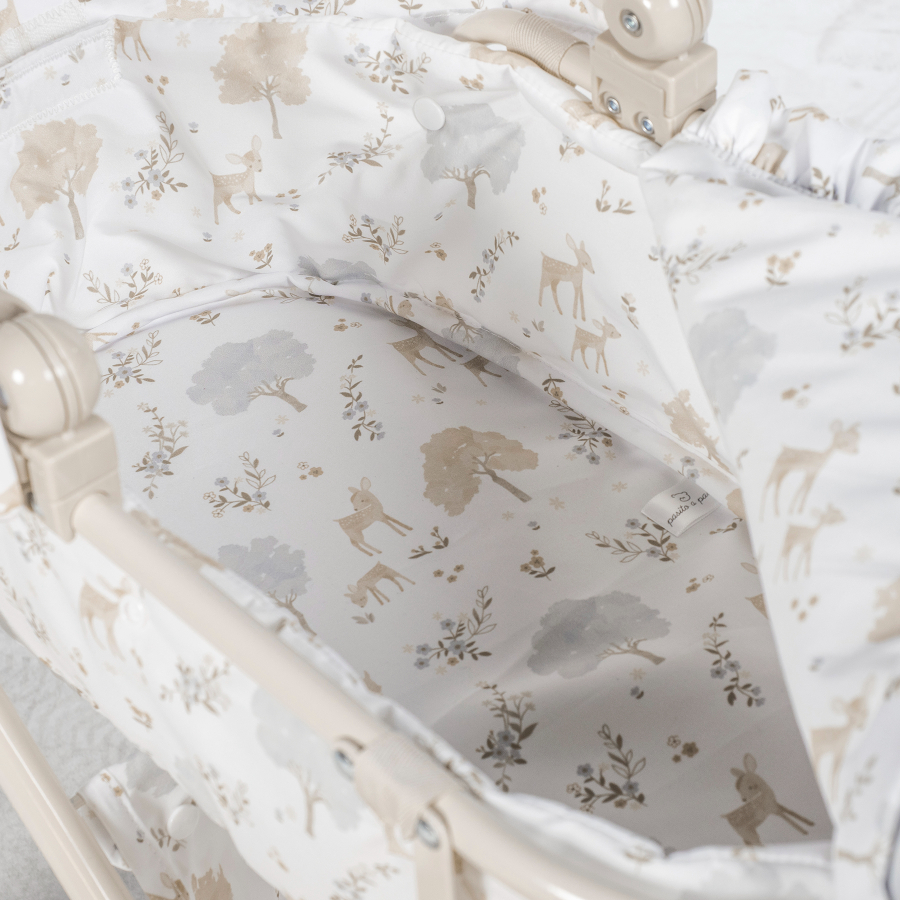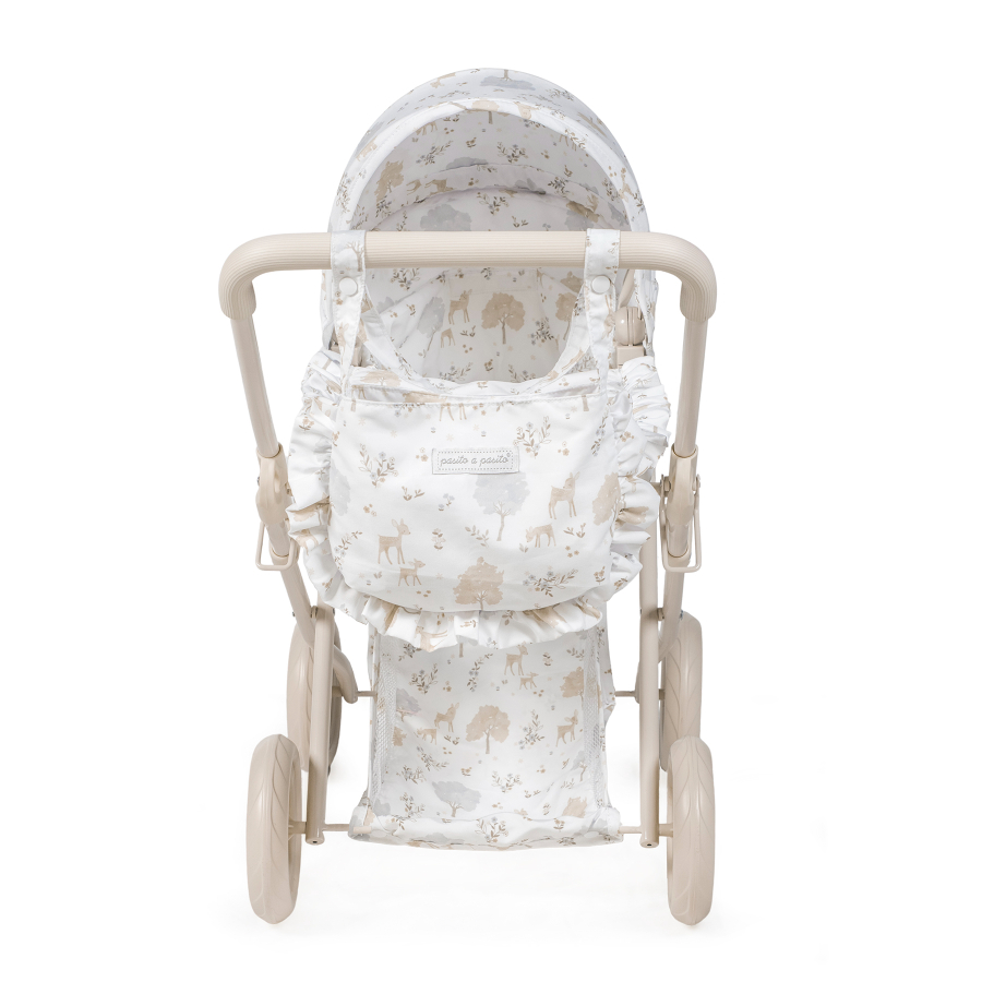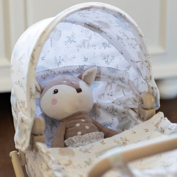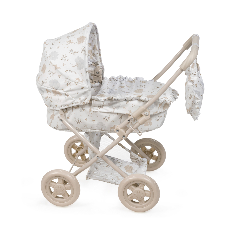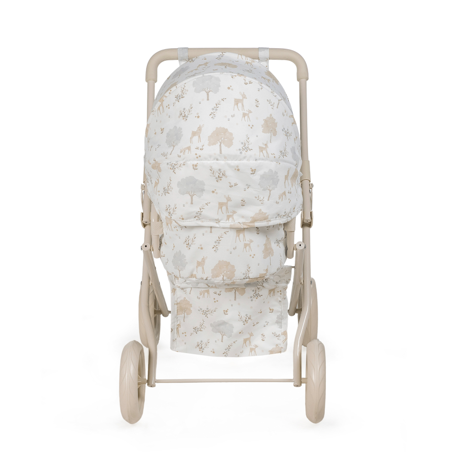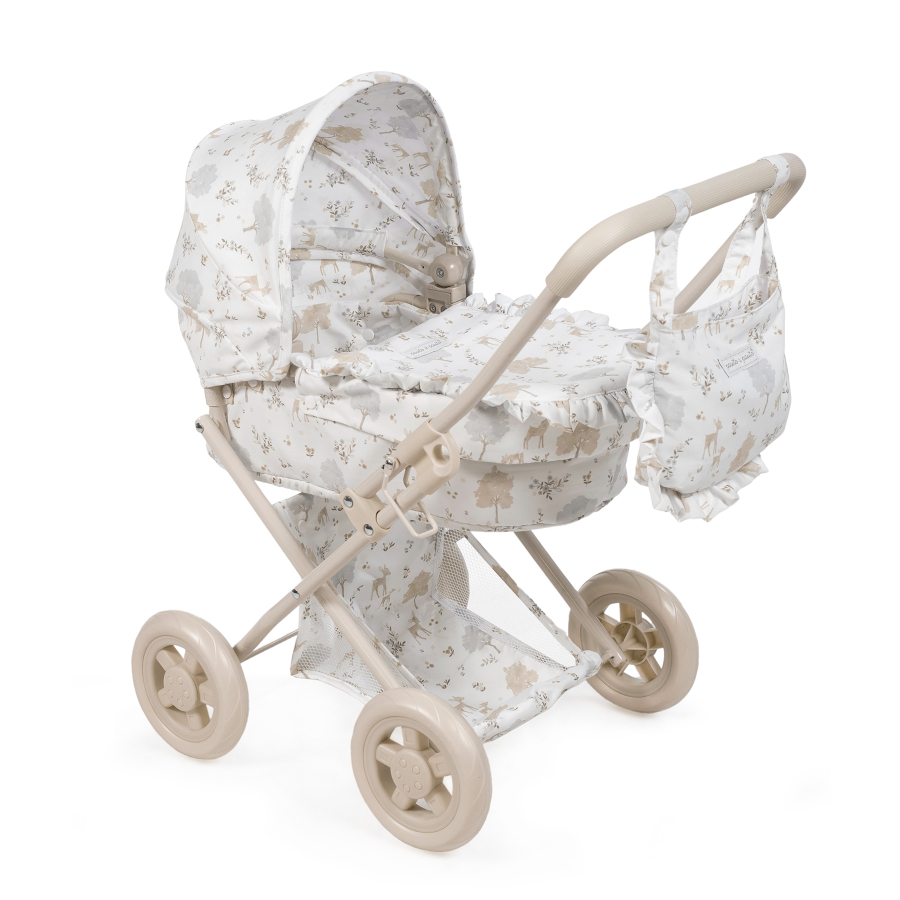 Cochecito para muñecas Nara con estampado de cervatillos en tonos beige.