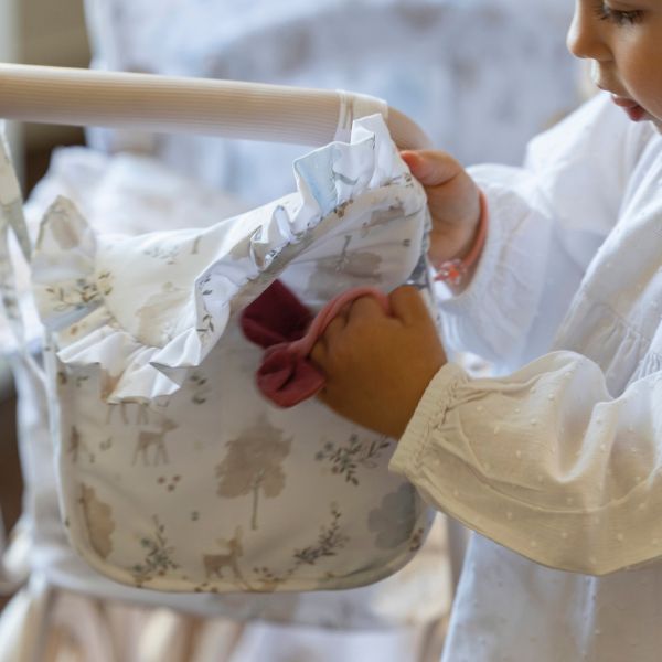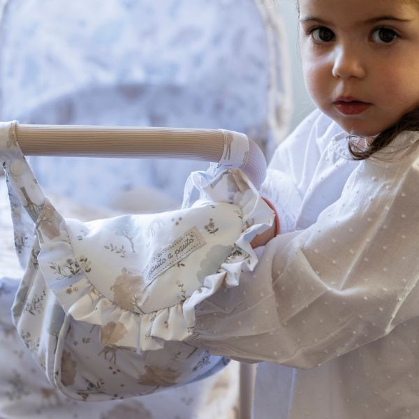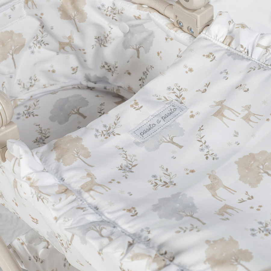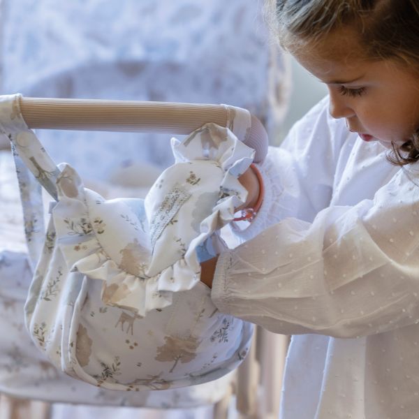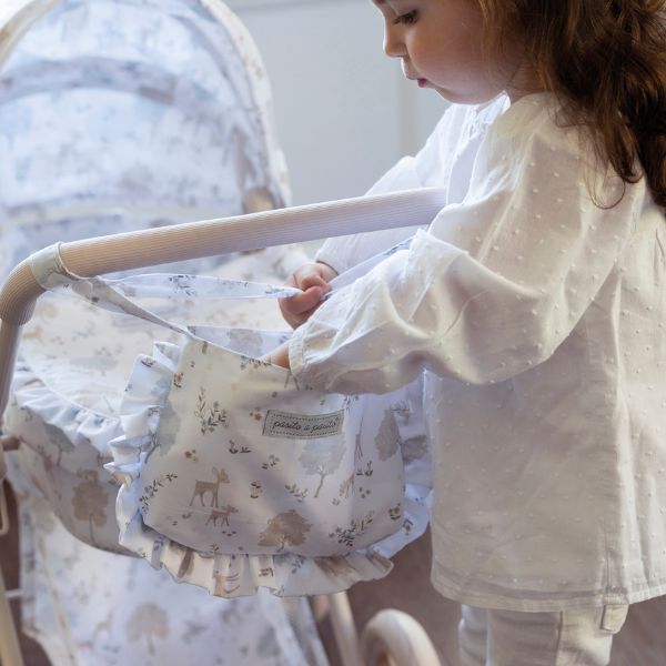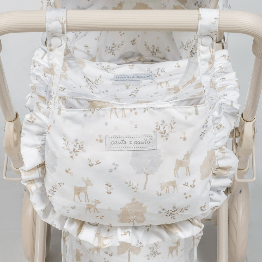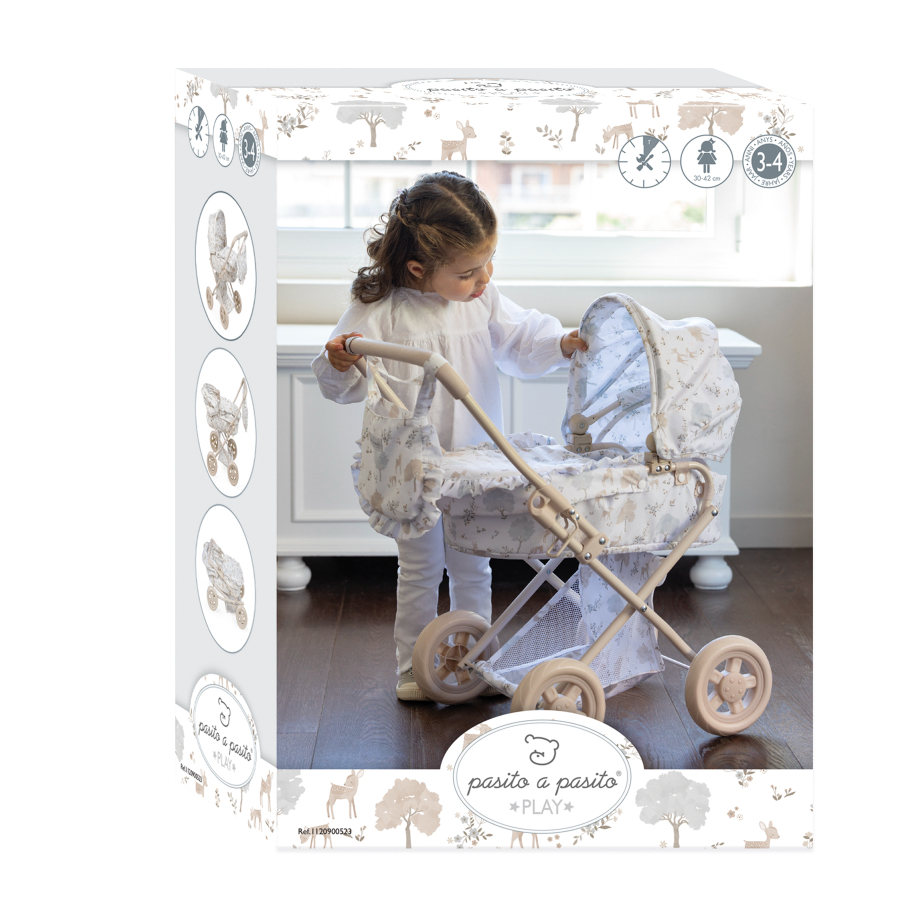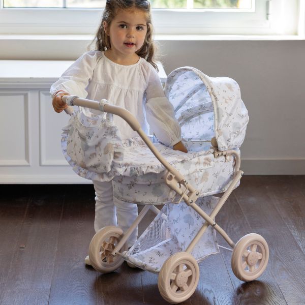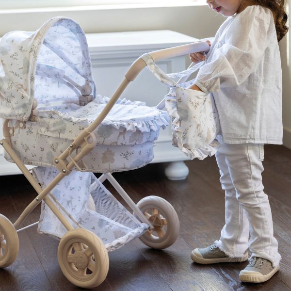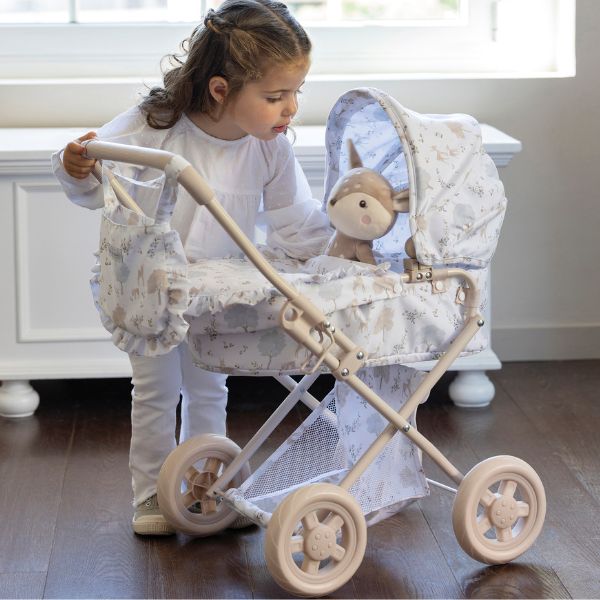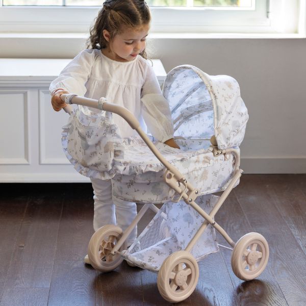 Cochecito para muñecas Nara con estampado de cervatillos en tonos beige.