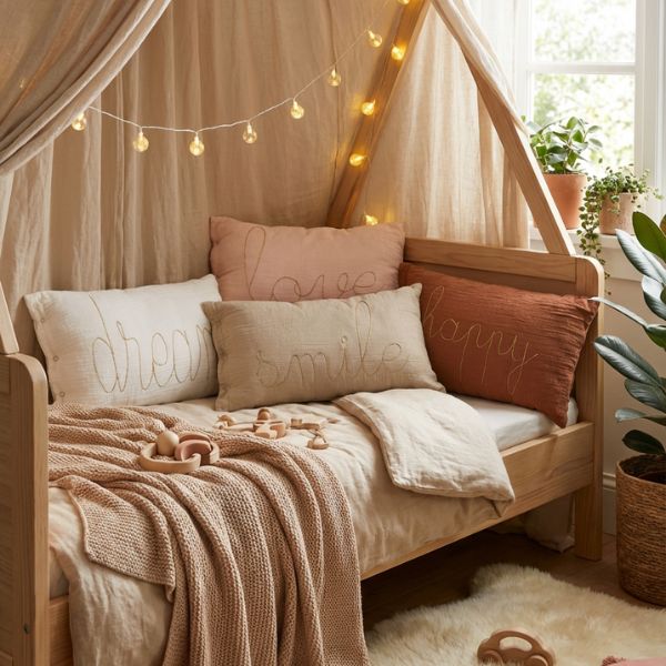 Cojín con forma rectangular en color verde, con la palabra “smile” bordada en color dorado. Colócalo encima de una cama o de un sillón para darle un toque de dulzura a la habitación de los peques.