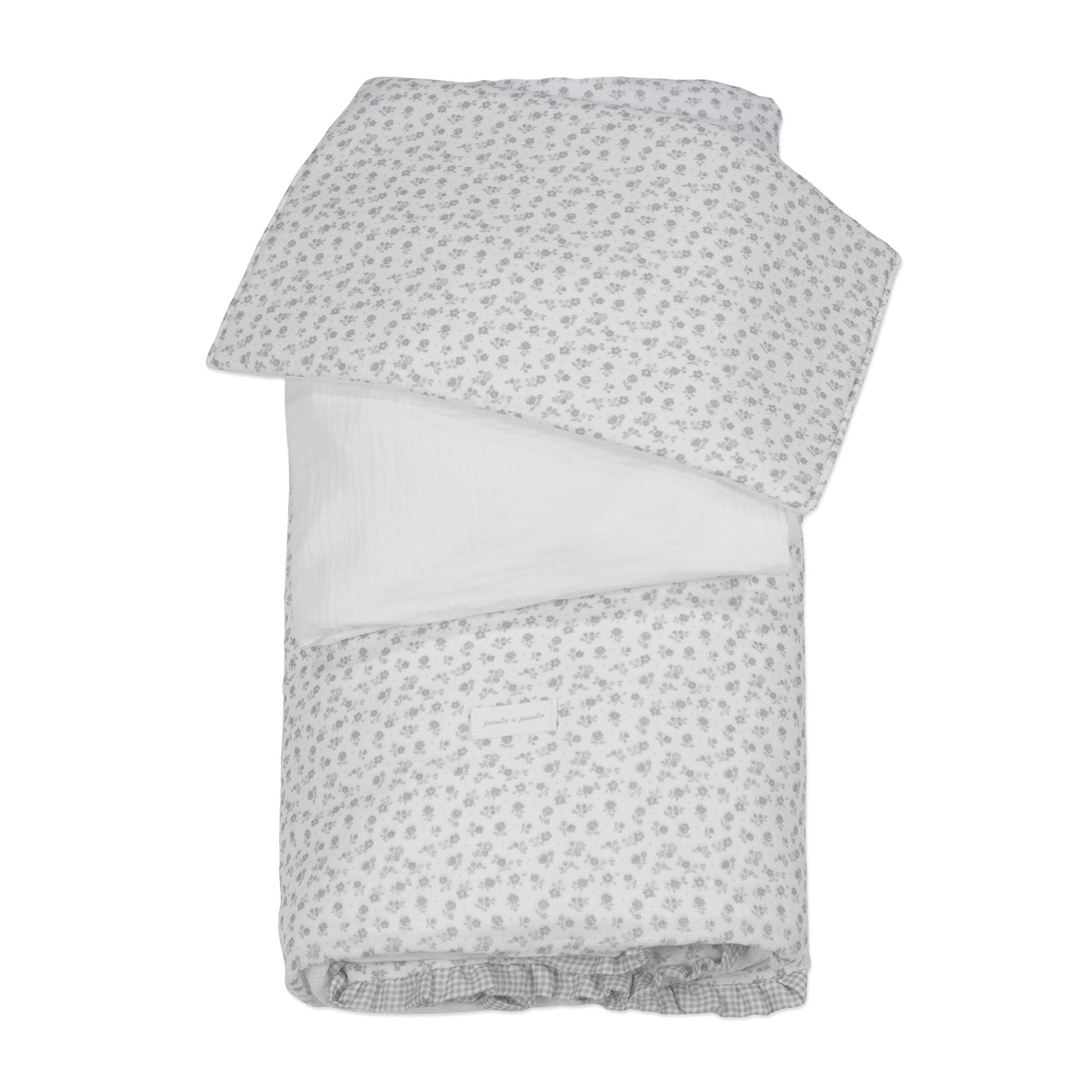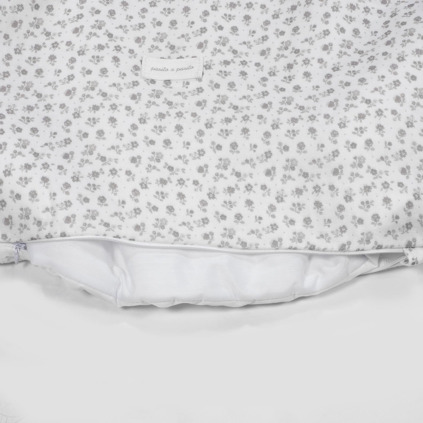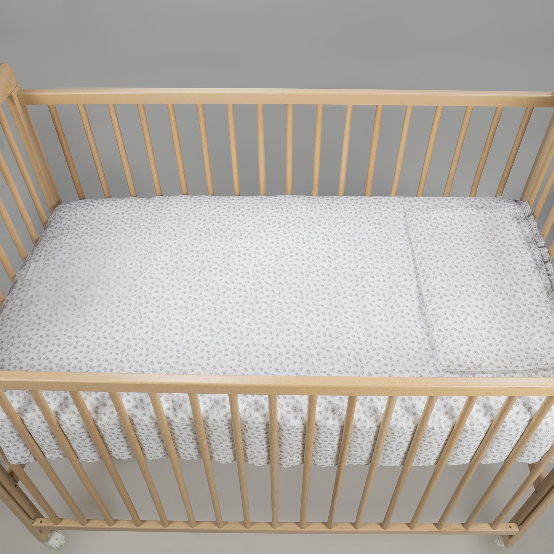 El Set de Edredón, Sábana Bajera y Almohada Little Bloom Flor Gris de Pasito a Pasito es la solución textil integral para vestir la cuna estándar de tu bebé (120×60 cm) con un estilo romántico y un confort térmico excepcional.