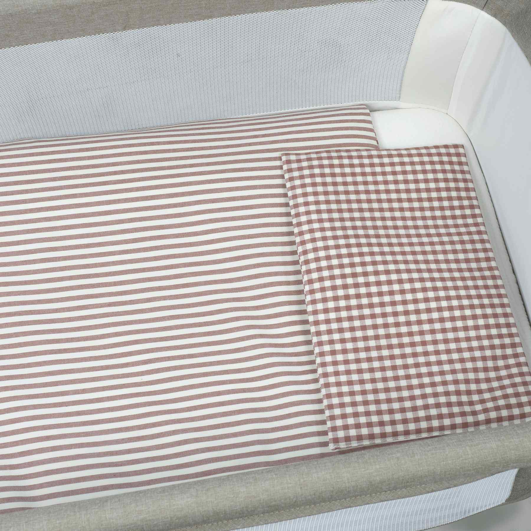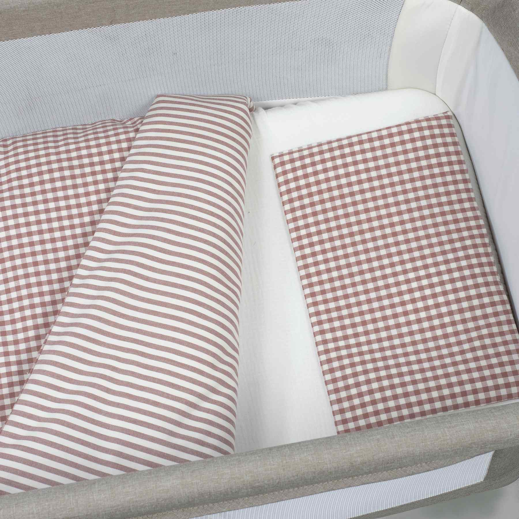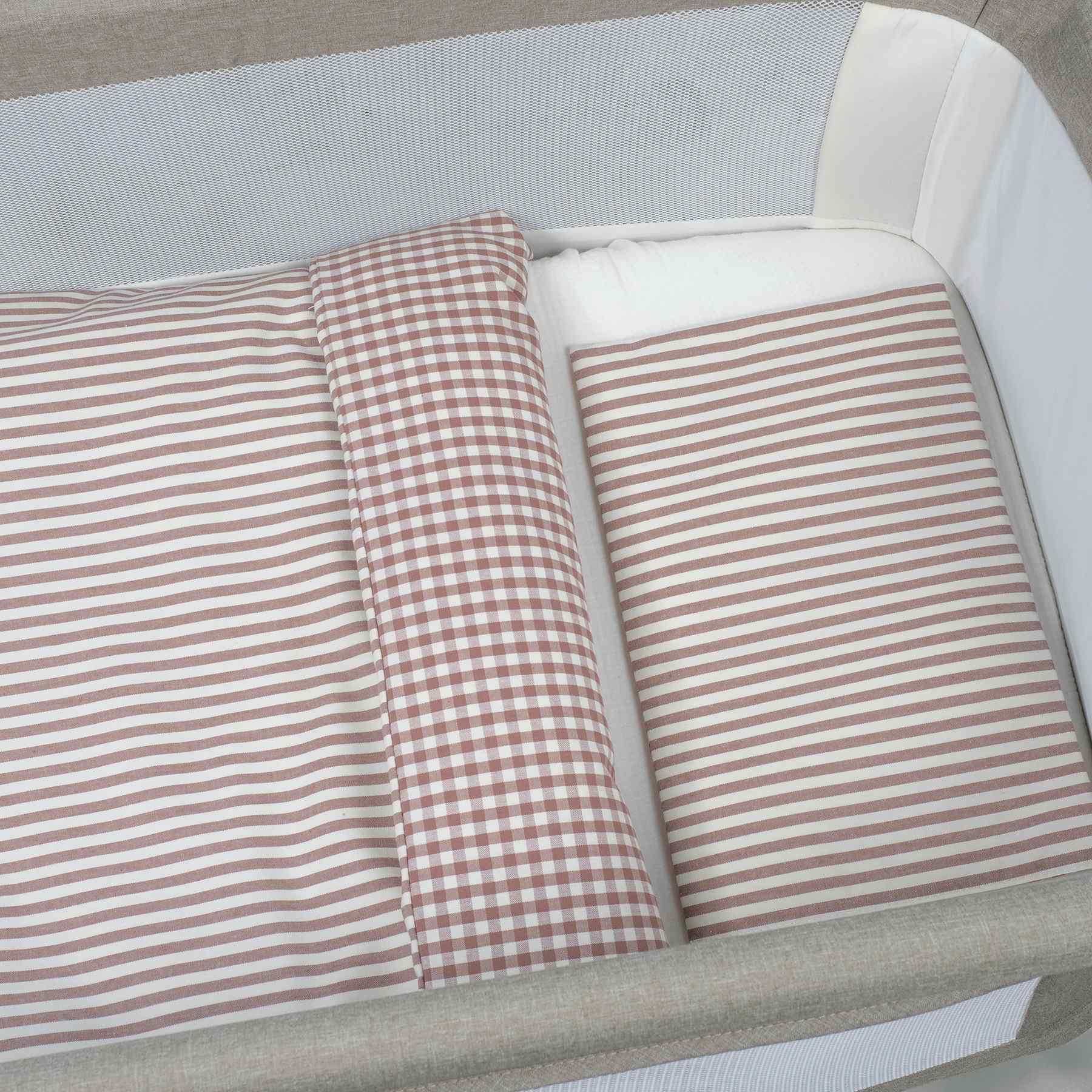 ROPA DE MINICUNAFundas nórdicas de minicuna Edredón+bajera+almohada minicuna 90x50cm Praliné Vichy/rayas moka