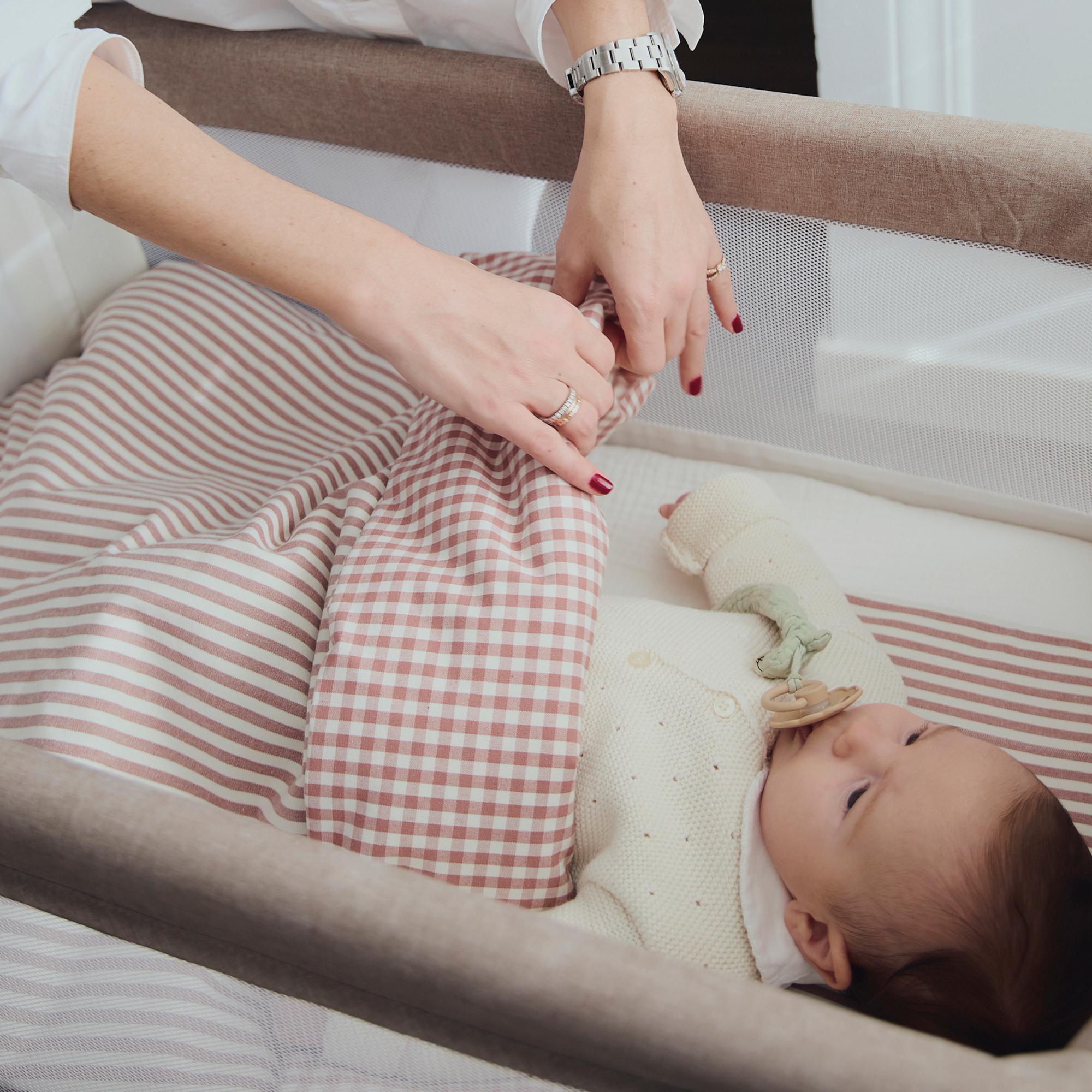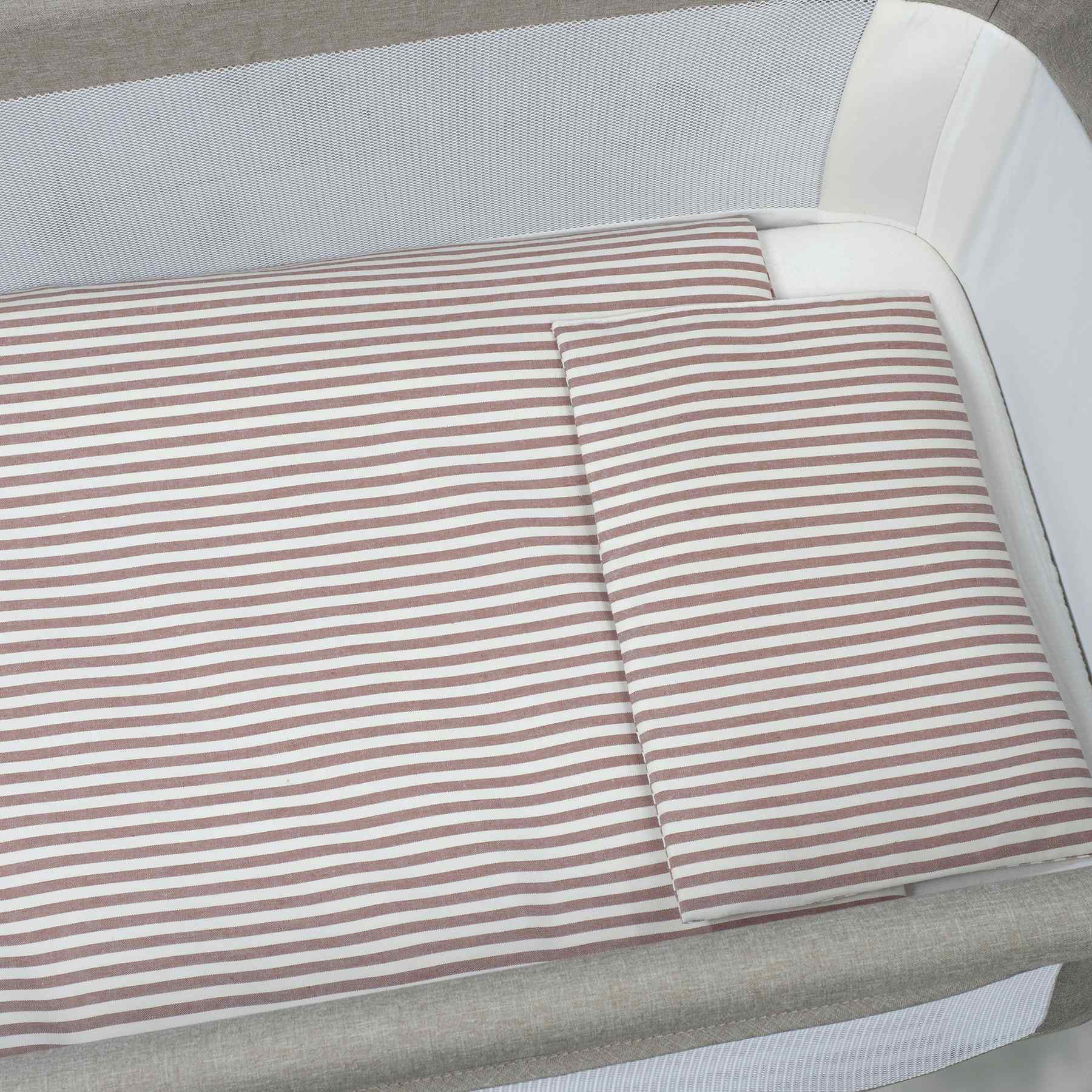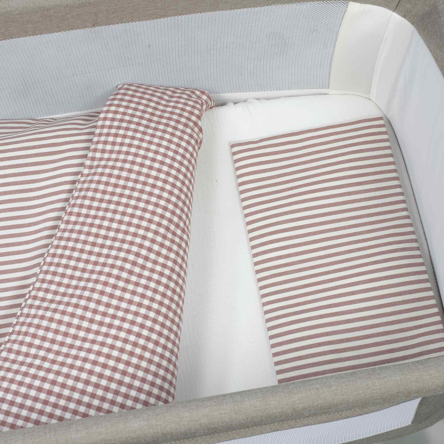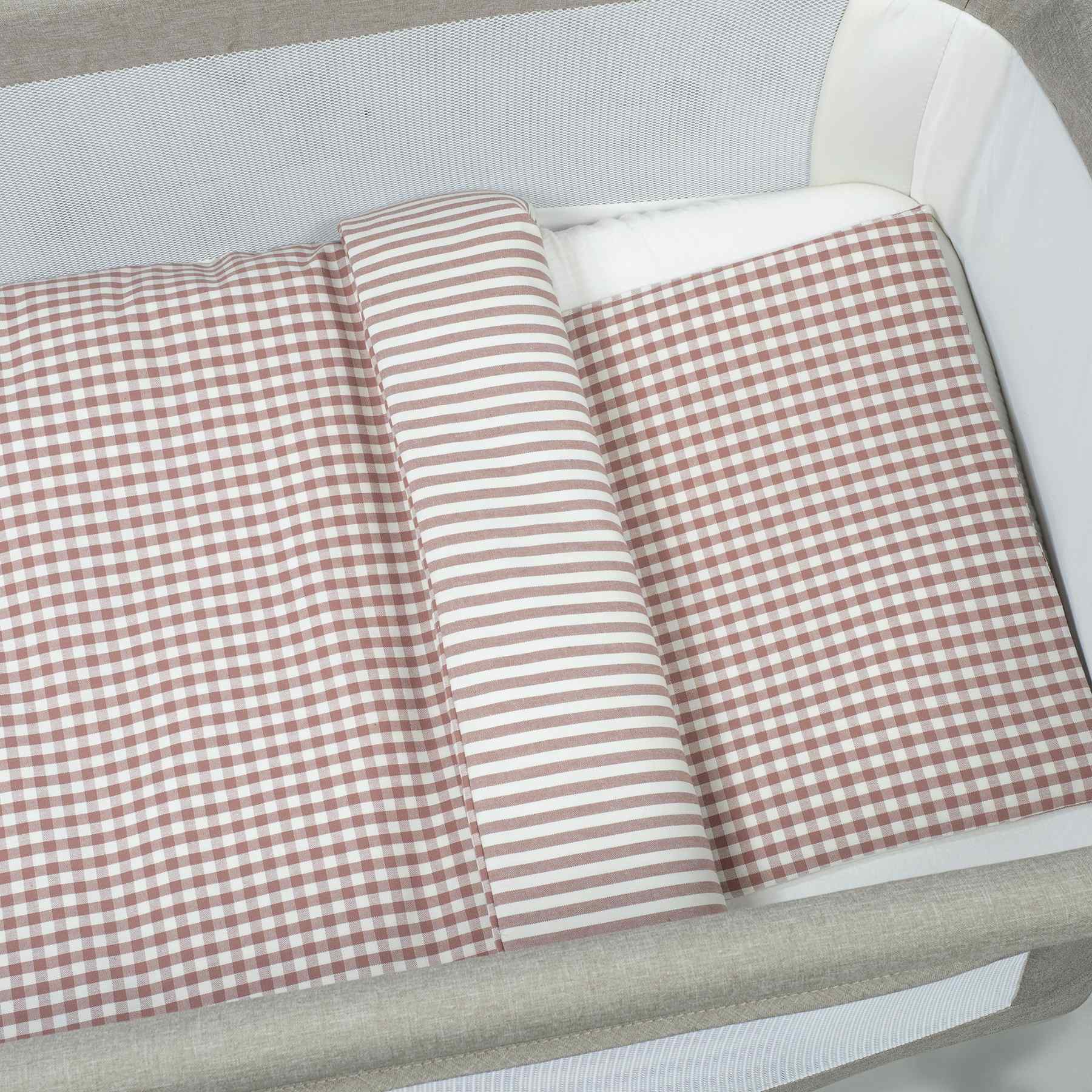 ROPA DE MINICUNAFundas nórdicas de minicuna Edredón+bajera+almohada minicuna 90x50cm Praliné Vichy/rayas moka