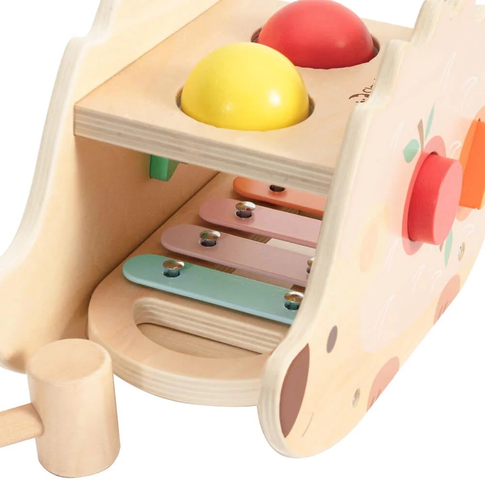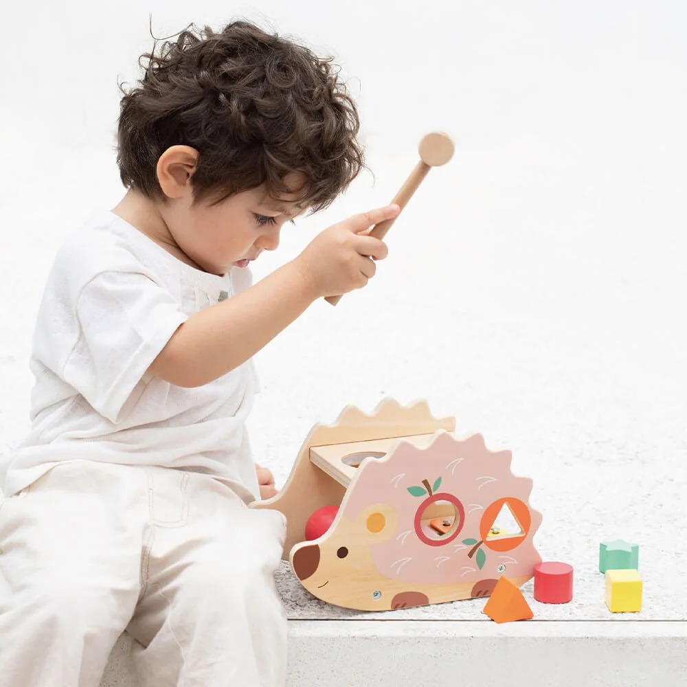 Este juguete de madera invita a los niños a golpear los cilindros de colores con un martillo, simulando las púas de un simpático erizo.