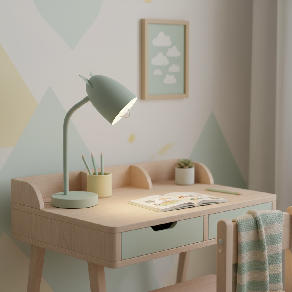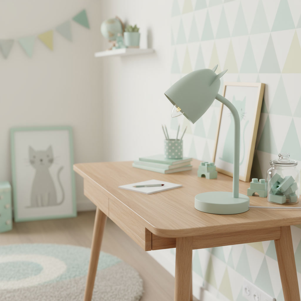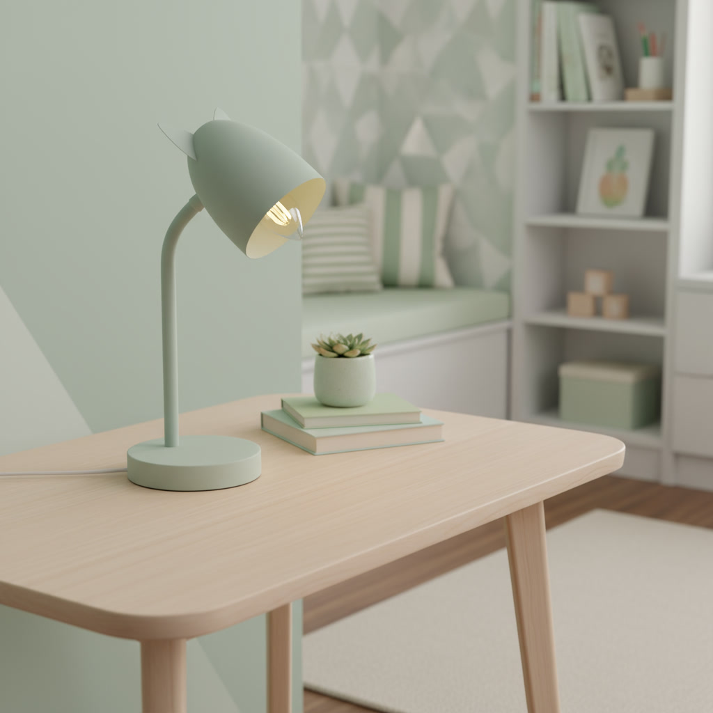 Divertida lámpara con orejitas en color verde. Perfecta para colocarla en un escritorio o mesita de noche.