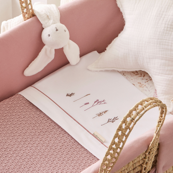 Moisés de mimbre con vestidura de Bimbidreams.