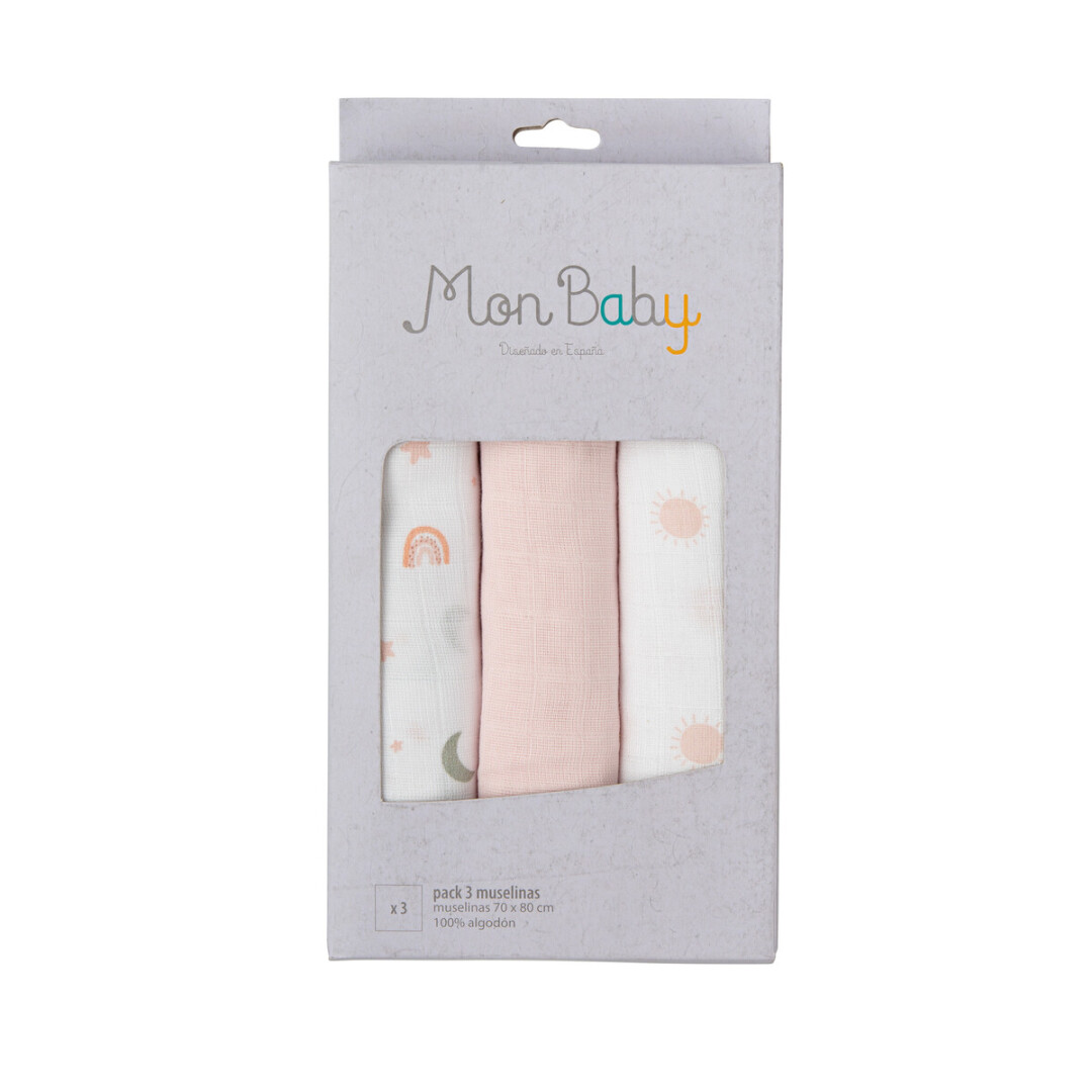 Este pack incluye 3 muselinas de 80×70 cm en un encantador estampado de astros.