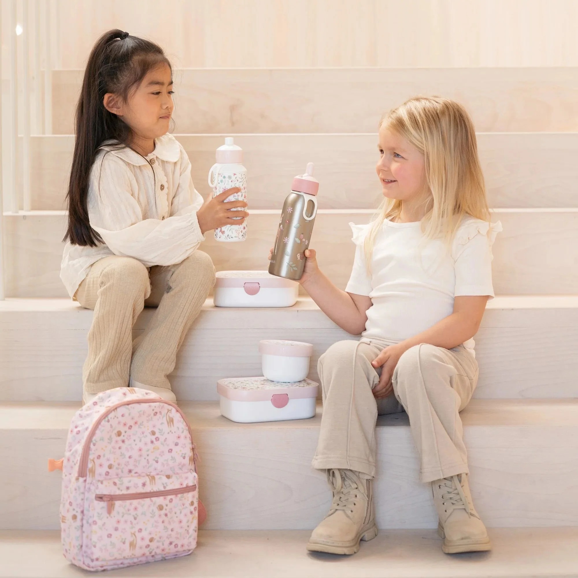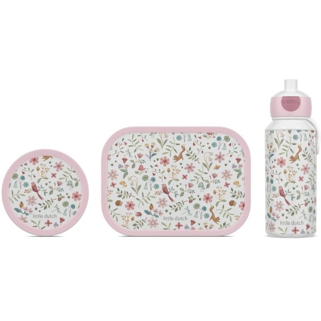 Pack de 3 piezas de almuerzo, ideal para llevarlo al colegio, guardería, en el parque o en las salidas y excursiones. La cajita rectangular, incorpora un tenedor y un separador extraíble que cuenta con dos compartimentos. La botella pop up está realizada a prueba de fugas. Y la cajita redonda es perfecta para llevar fruta o snacks, además incorpora un tenedor.