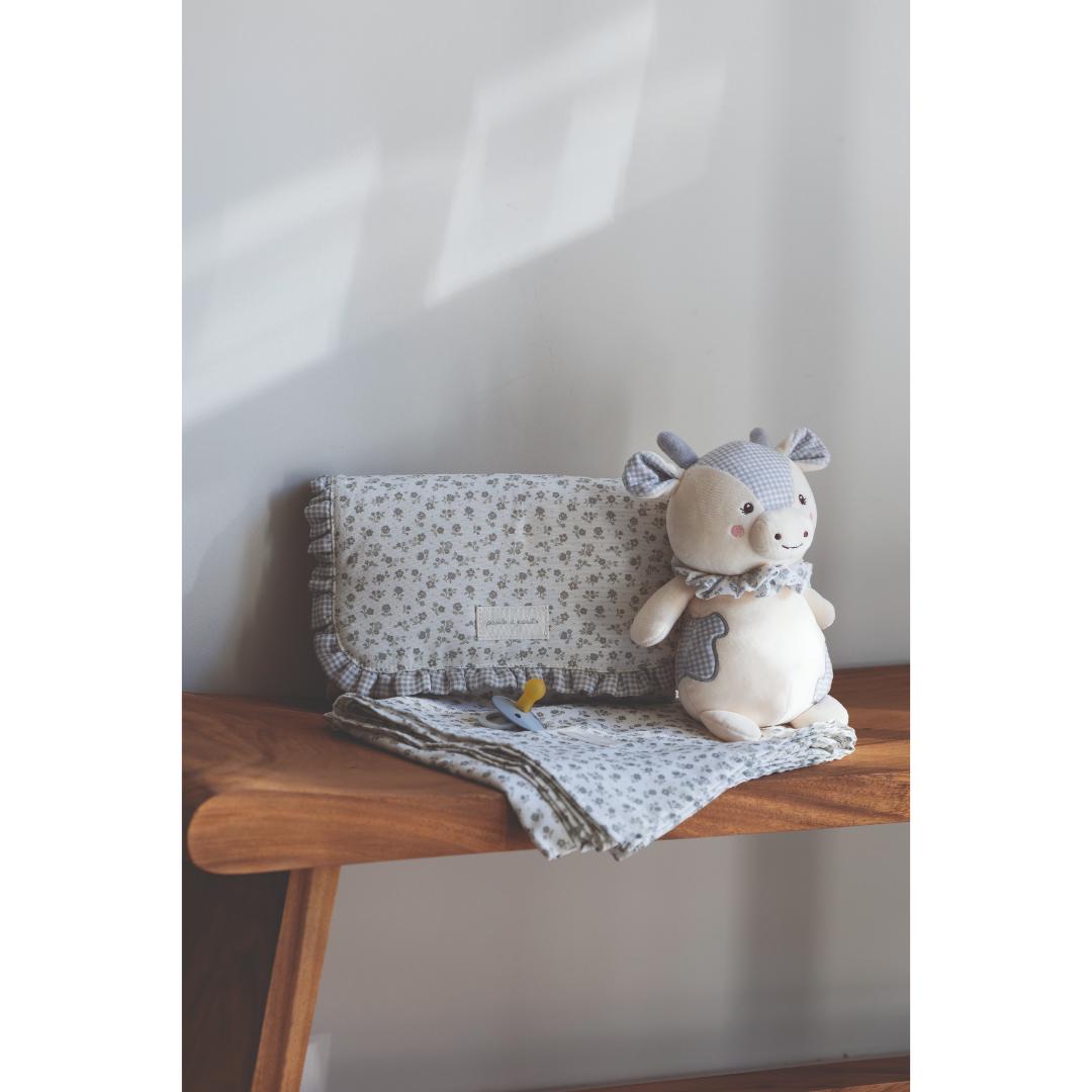 El Peluche musical Vaca Little Bloom Gris de Pasito a Pasito es el accesorio de descanso perfecto para acompañar a tu bebé desde sus primeros días de vida.