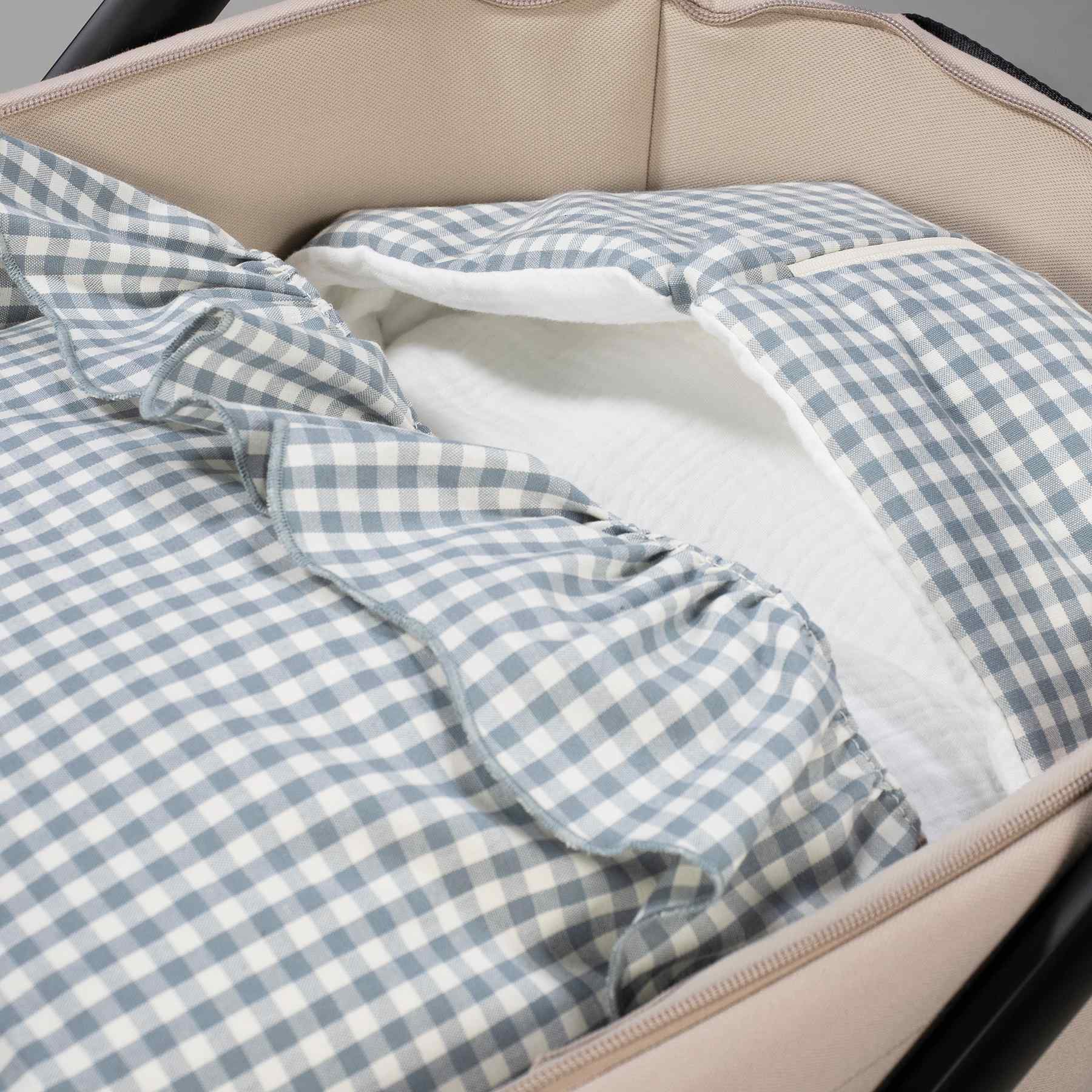 Confeccionado en muselina 100% algodón, ofrece una textura suave y transpirable, ideal para paseos en el capazo o momentos de descanso en la cuna.