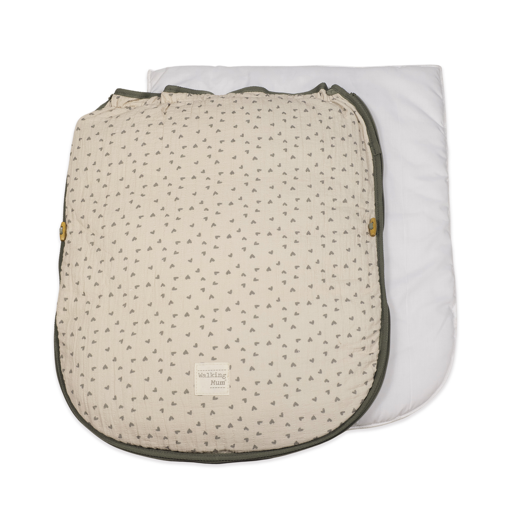 Funda con estampado de corazones, ideal para cubrir la base de la silla de paseo. Incorpora un saco para cubrir a tu bebé durante los meses de primavera y otoño. Es universal, por lo que se adapta a la mayoría de sillas del mercado. El respaldo está fabricado en tejido de malla para evitar la sudoración excesiva del bebé y aislar la humedad. Cuenta con una base en el reposapiés en poliéster para poder facilitar la limpieza. Además dispone de de varias aperturas (ojales) y ajustes para adaptar el saco a la silla y hacer que el paseo de tu bebé sea más seguro y cómodo.
