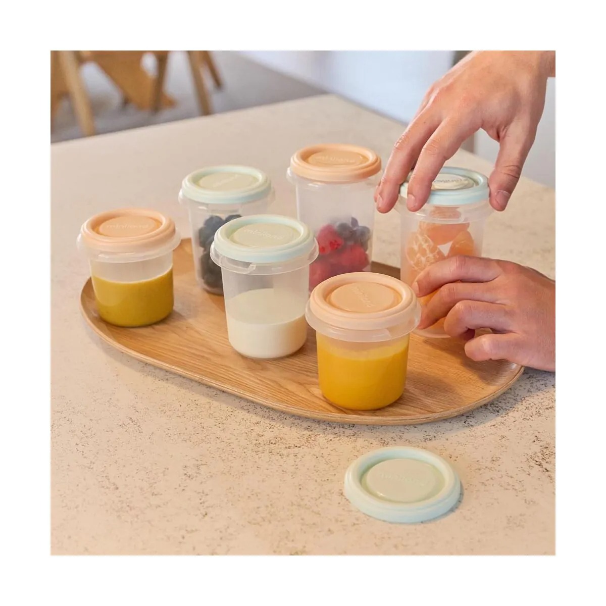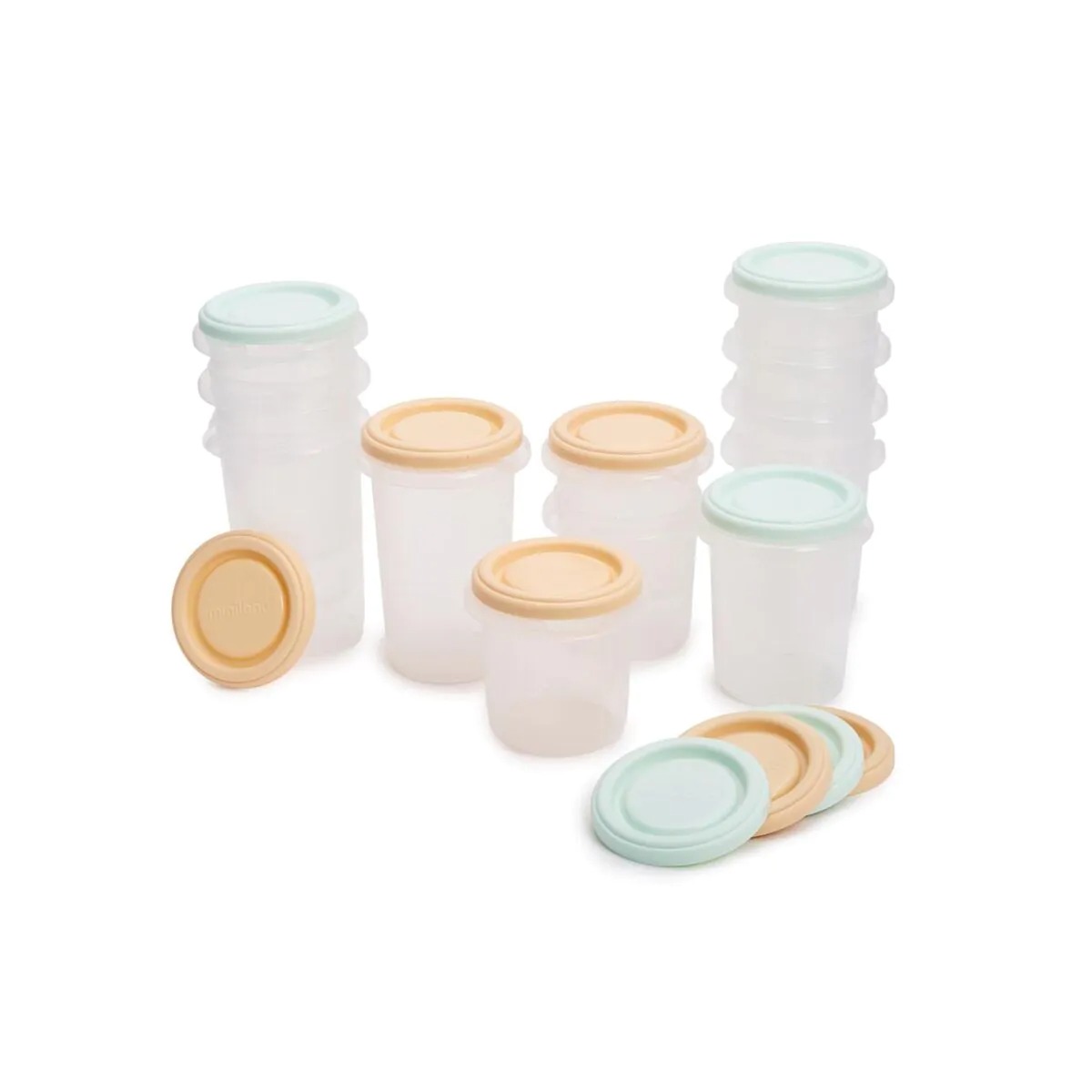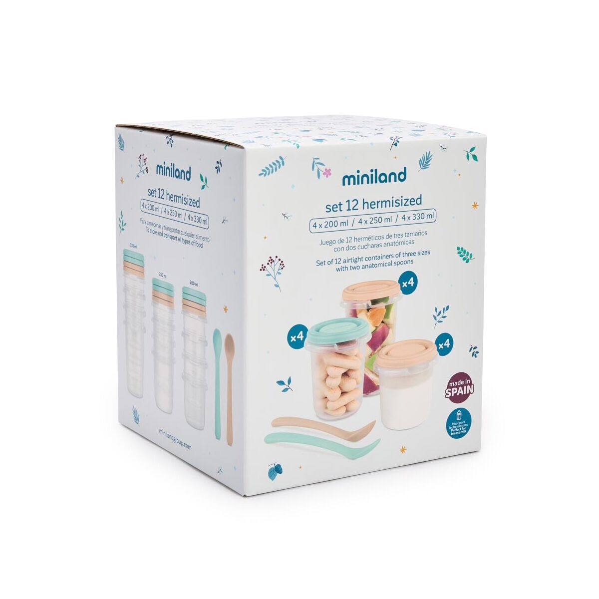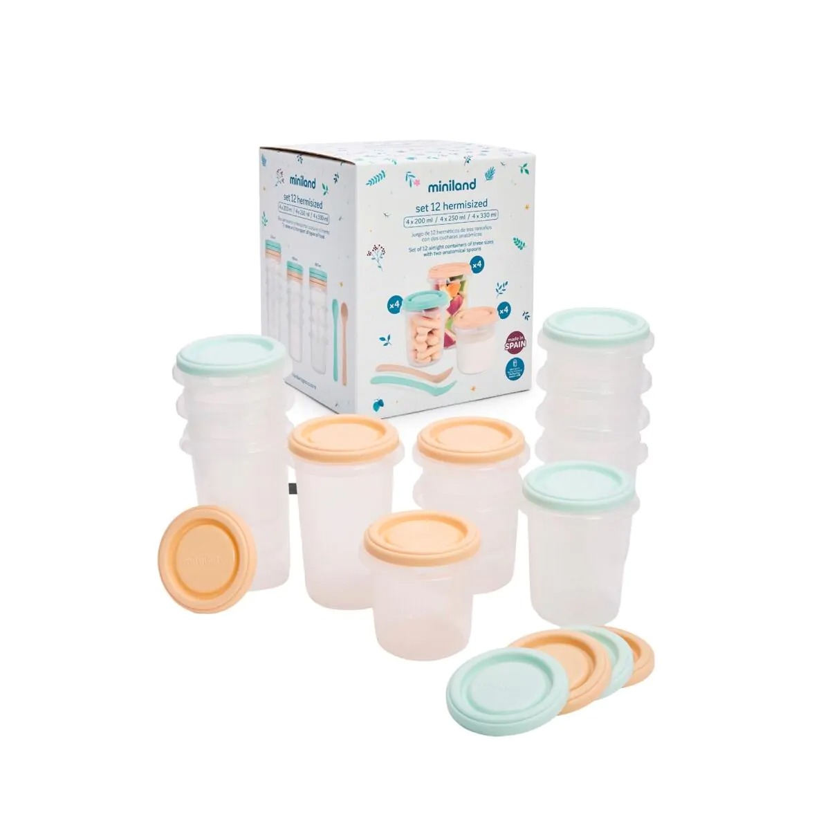 El Set de 12 Recipientes Herméticos Graduados con Cucharas Dreamland de Miniland es la solución más completa y versátil para las familias que desean una organización total de la alimentación infantil.