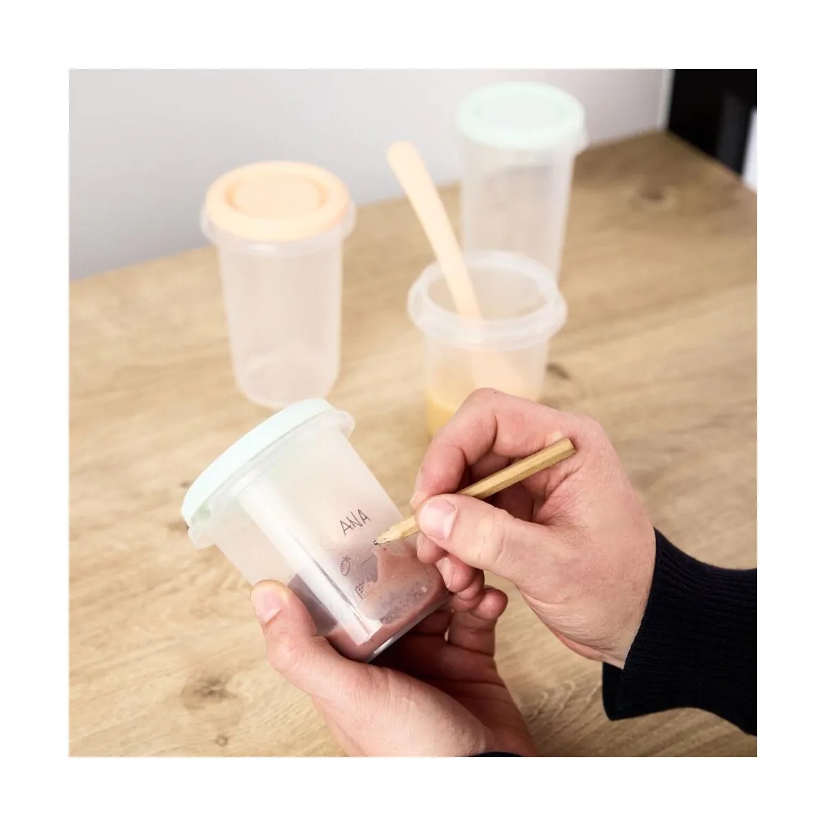 - Control de porciones: Vasos con escala graduada lateral para medir con precisión las tomas y superficie especial para escribir con lápiz el nombre, la fecha o el tipo de contenido.