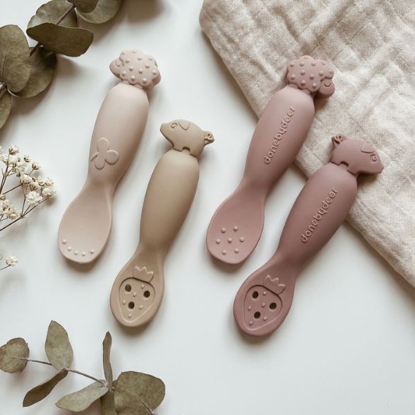 Incluye dos cucharas: una para mojar y otra para recoger, ambas con formas y texturas que facilitan su uso por manos pequeñas.