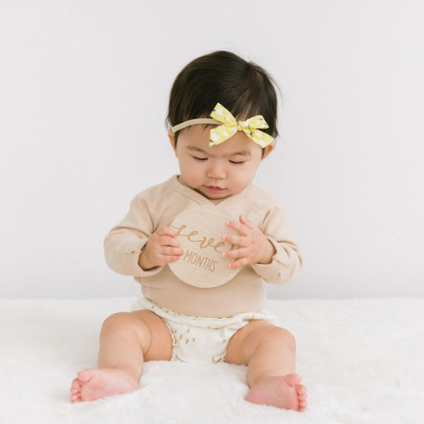 Tarjetas de madera que vienen marcadas desde un mes a doce meses, y con las frases  “hello world” y “oh baby”. Podrás fotografiar mes a mes tu embarazo o el primer año de vida de tu bebé. Es una estupenda opción para hacer un regalo.