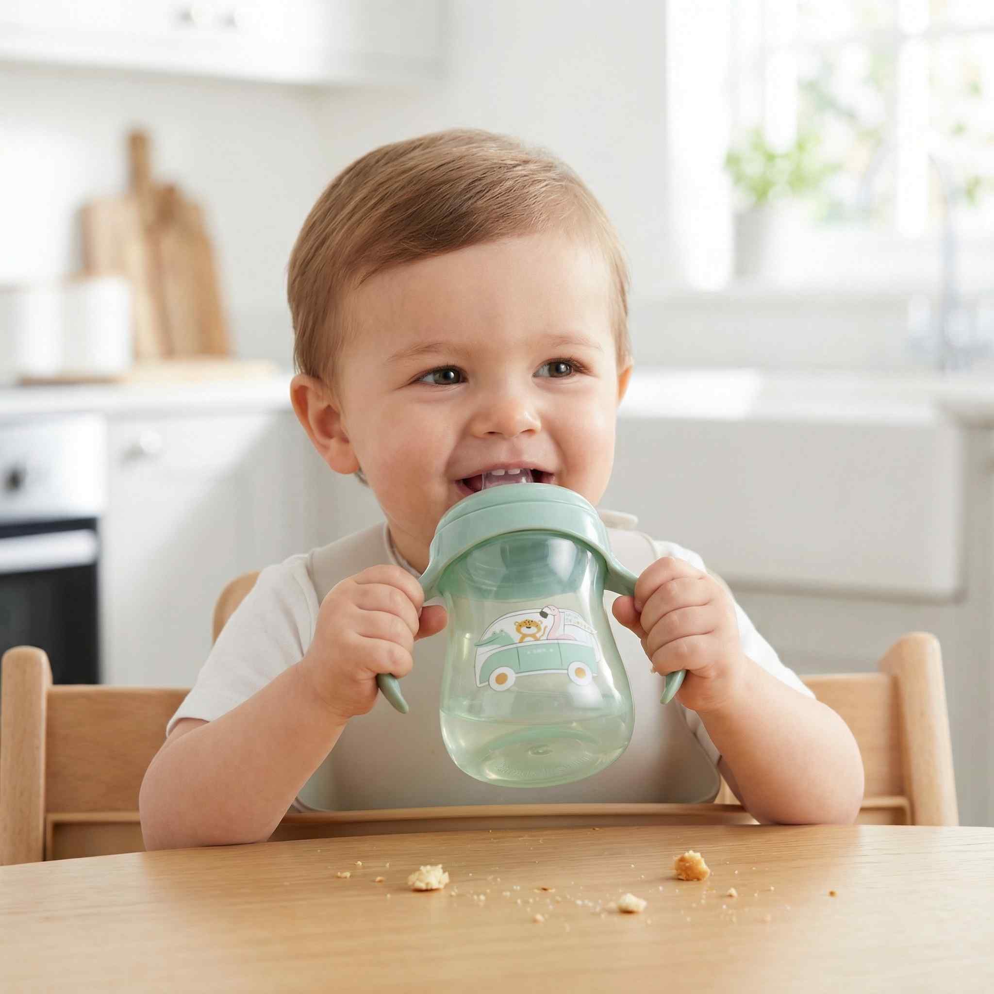 Esta práctica taza de aprendizaje con asas, será el complemento perfecto que hará más sencilla la transición del biberón al vaso. Su boquilla de silicona anticólicos es muy suave al contacto con las encías y no las daña, resultando cómoda incluso durante la dentición.