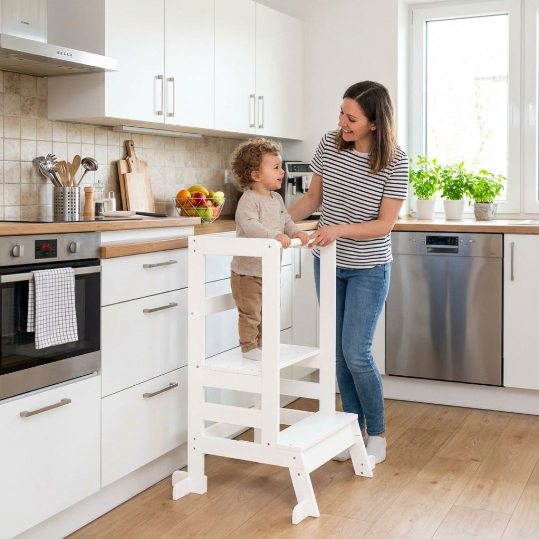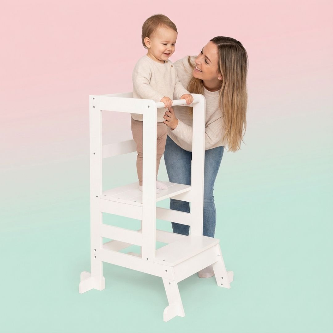 Escalera de un solo peldaño con plataforma segura, la torre de observación “Lea” permite a los más pequeños crecer y participar en las tareas cotidianas: preparar la comida, poner la mesa, lavarse las manos o los dientes en el lavabo…