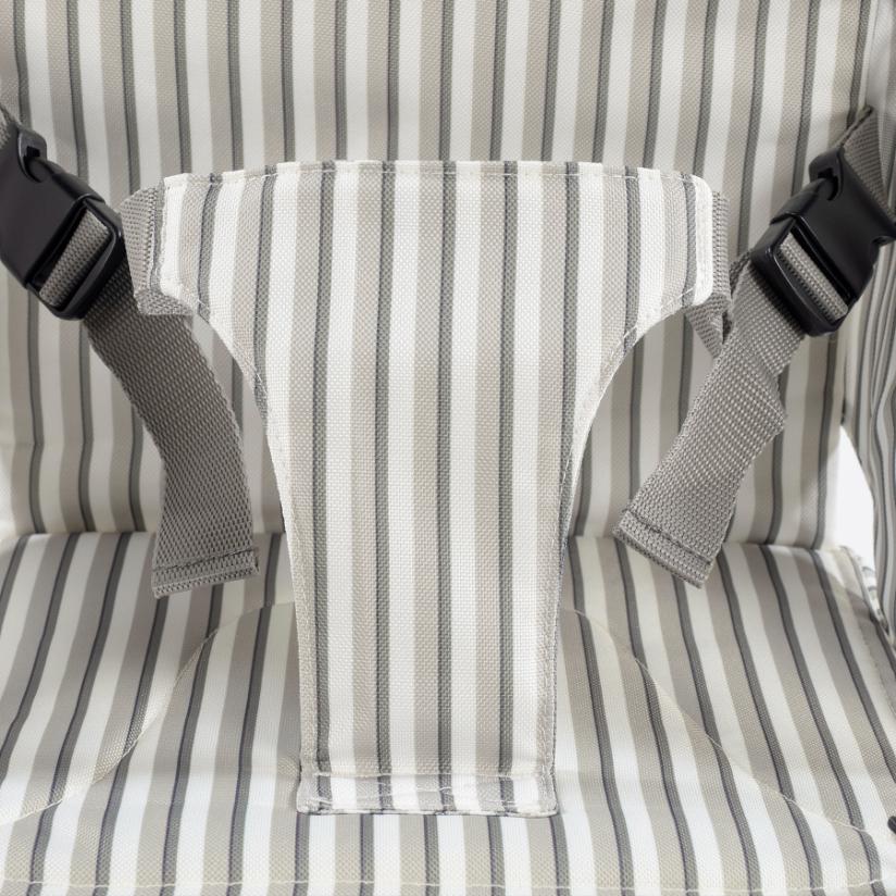 Cuenta con una correa para llevarla cómodamente al hombro. Incluye un compartimento de almacenamiento en la base, perfecto para guardar pañales, toallitas u otros accesorios esenciales del bebé. Se adapta a la mayoría de las sillas de adulto estándar, ofreciendo versatilidad y comodidad en diferentes entornos.